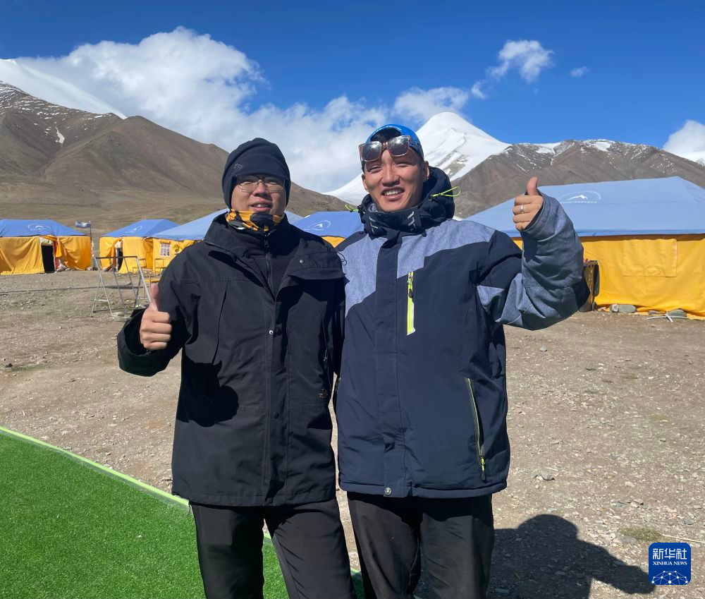8月8日,熊警(左)和方源達(dá)在玉珠峰登山大本營(yíng)。新華社記者 李琳海 攝