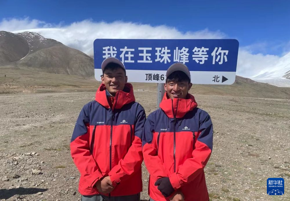 8月8日,扎西多杰(左)和才丁在玉珠峰登山大本營(yíng)合影。新華社記者 李琳海 攝