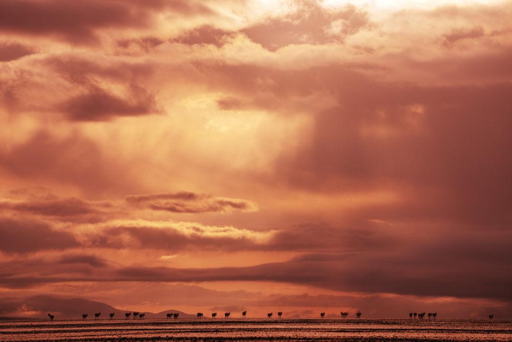 6月15日清晨雪后,在羌塘國家級自然保護(hù)區(qū),迎著朝霞前行在遷徙路上的一群藏羚羊。新華社記者 費(fèi)茂華 攝