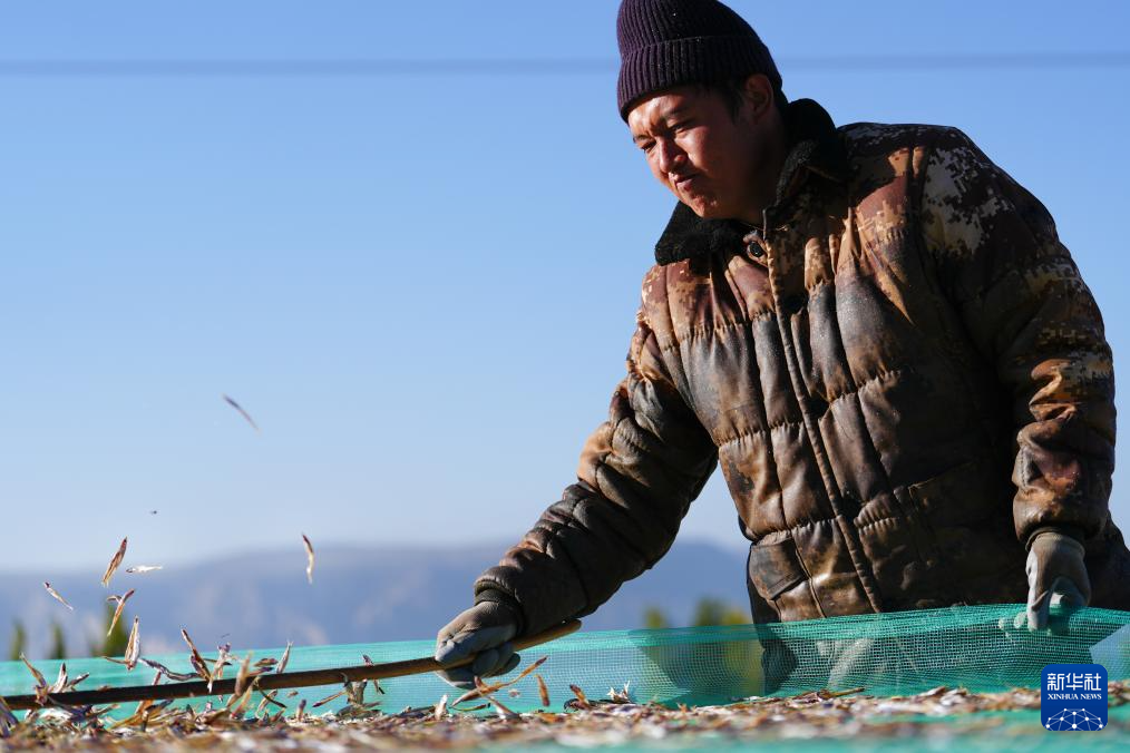 10月18日,在青海省海南藏族自治州共和縣龍羊新村龍羊峽海湖漁業(yè)捕撈合作社,一名工人在鋪曬小銀魚(yú)。新華社記者 齊芷玥 攝