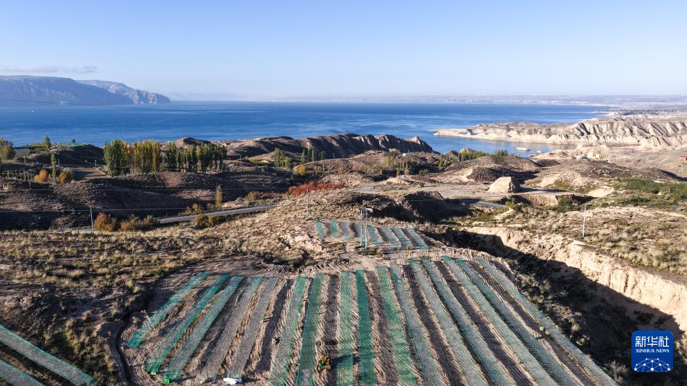 10月18日拍攝于青海省海南藏族自治州共和縣龍羊新村龍羊峽海湖漁業(yè)捕撈合作社的小銀魚(yú)晾曬網(wǎng)(無(wú)人機(jī)照片)。新華社記者 齊芷玥 攝