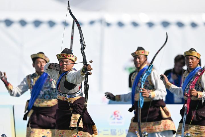 2024年11月27日,第十二屆全國少數(shù)民族傳統(tǒng)體育運動會表演項目中,西藏隊選手表演《響箭》。新華社記者 孫凡越 攝