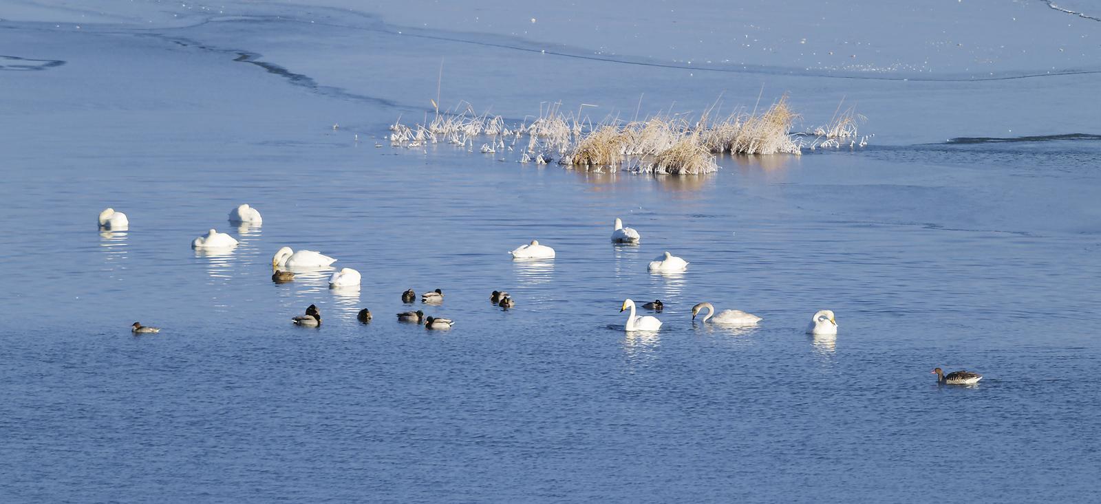 都蘭湖作為固定監(jiān)測點(diǎn),冬季水鳥監(jiān)測已持續(xù)四年,數(shù)據(jù)比較穩(wěn)定。鐘悅陶翻出去年的記錄給我看:大天鵝18只,綠頭鴨200多只,灰雁2只。和今天的數(shù)據(jù)相差不大,說明這里的越冬環(huán)境對水鳥而言是可靠的。