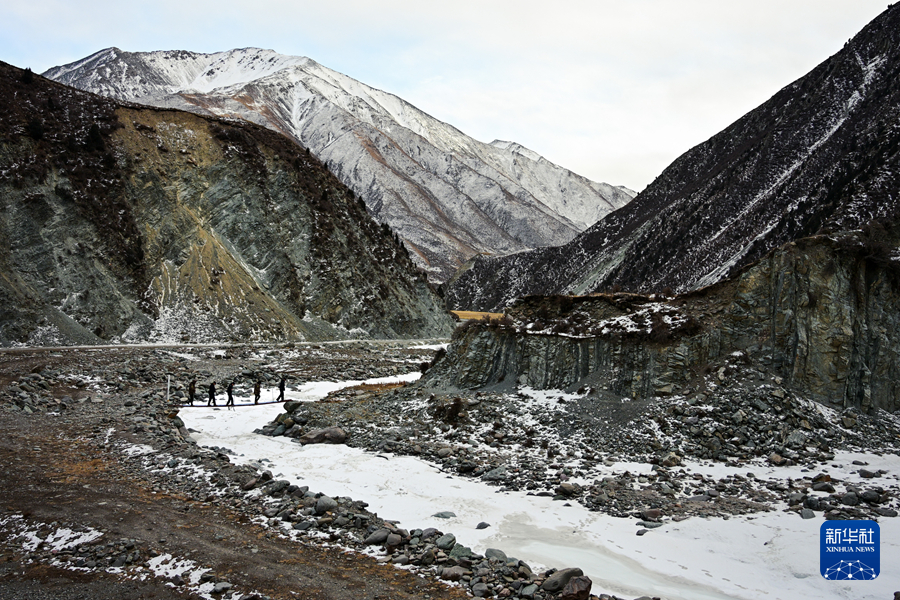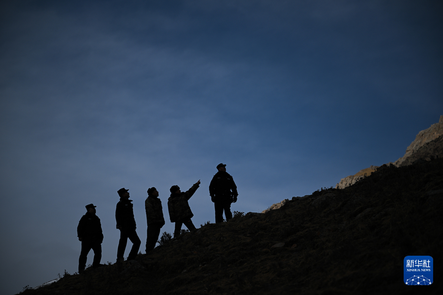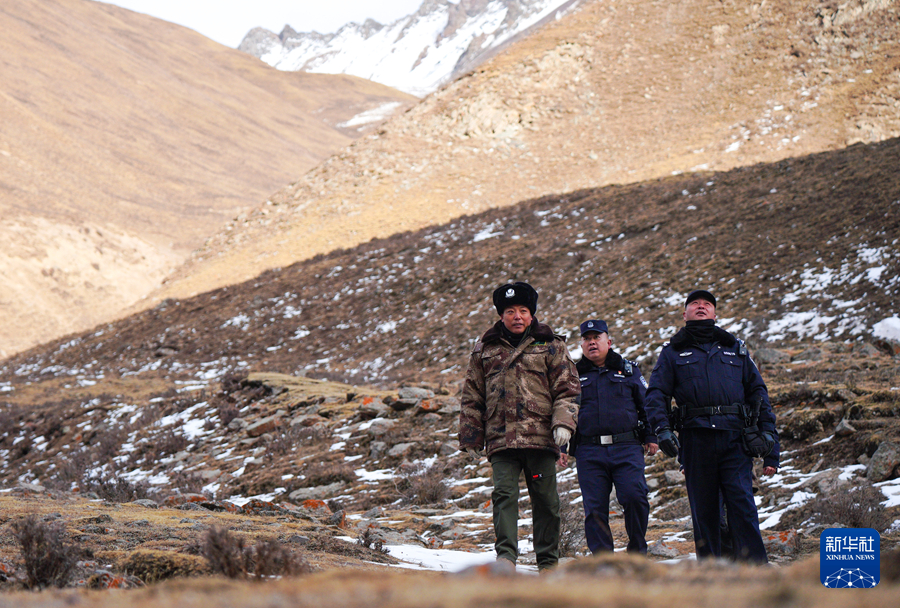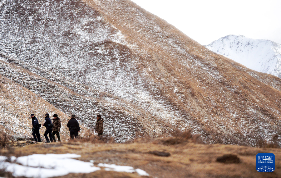 1月8日,在青海省海北藏族自治州門(mén)源回族自治縣境內(nèi)的老虎溝,民警和生態(tài)管護(hù)員在祁連山巡護(hù)。新華社記者 張龍 攝
