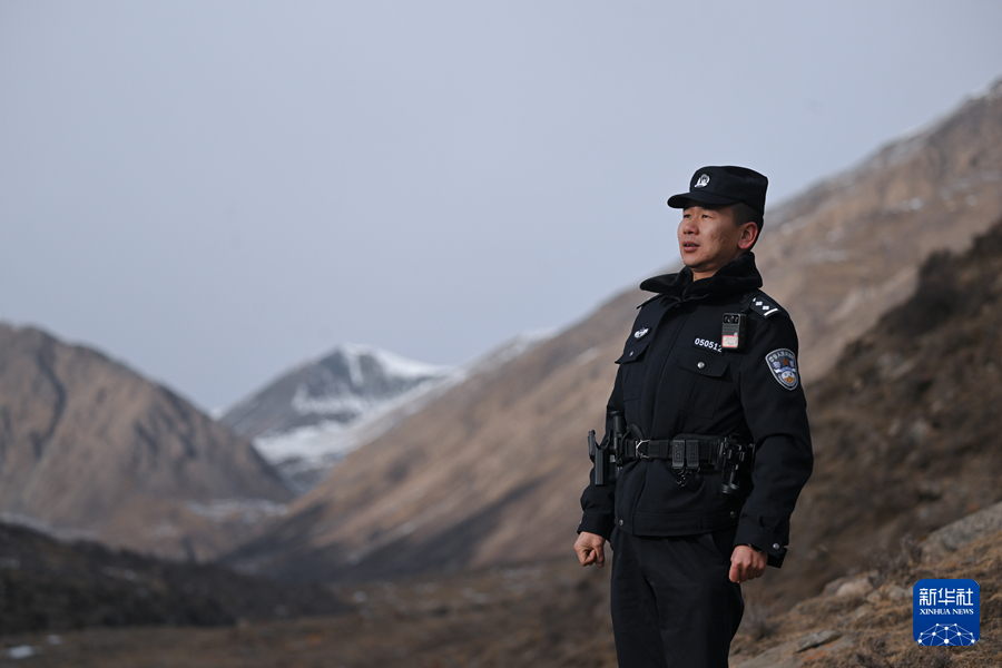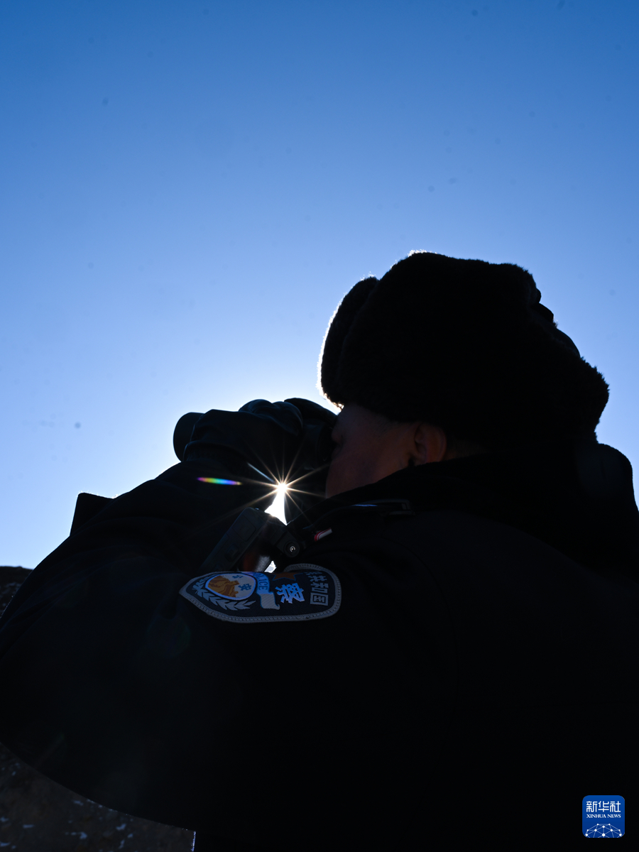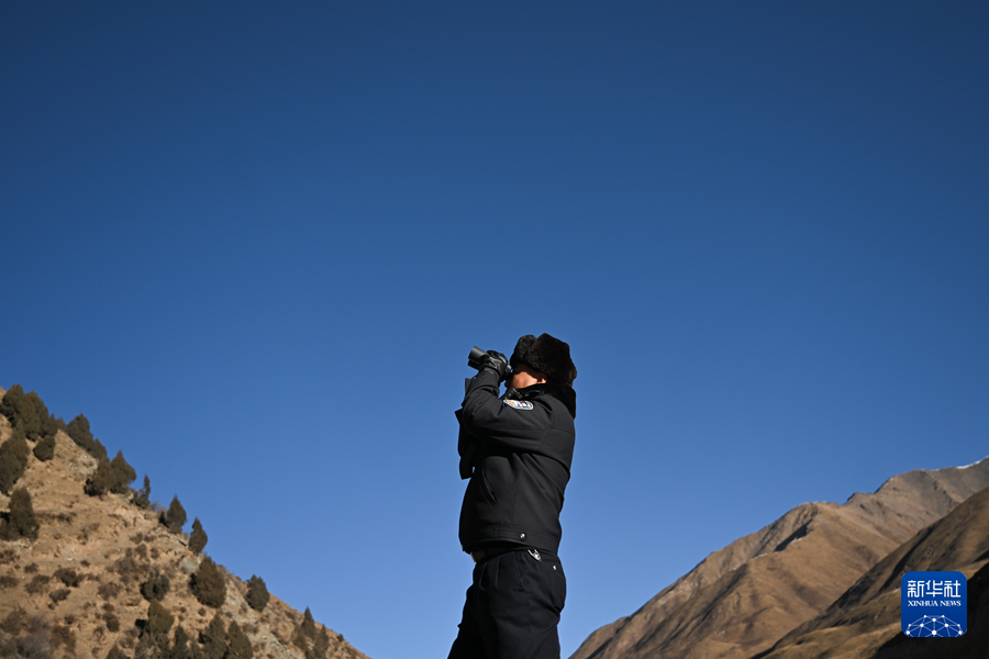 1月9日,在青海省海北藏族自治州門(mén)源回族自治縣境內(nèi)的老虎溝,民警郭建業(yè)在用望遠(yuǎn)鏡查看遠(yuǎn)處。新華社記者 張龍 攝