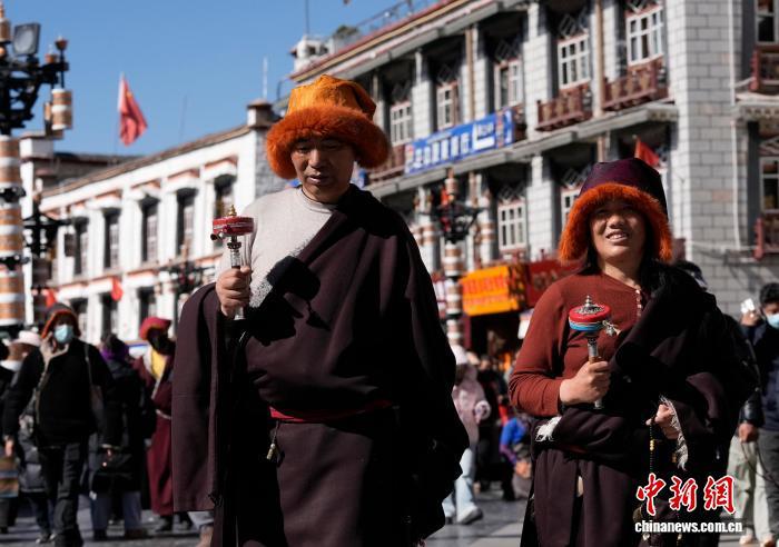 1月23日,西藏拉薩八廓街,信眾手持轉(zhuǎn)經(jīng)筒轉(zhuǎn)經(jīng)。冬季高原進(jìn)入農(nóng)閑期,眾多藏傳佛教信眾從各地來到拉薩,沿布達(dá)拉宮、大昭寺等地轉(zhuǎn)經(jīng)、朝拜、祈福。中新社記者 李林 攝