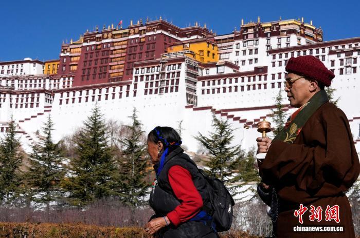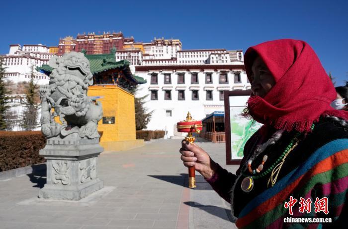 1月23日,西藏拉薩布達(dá)拉宮腳下,信眾手持轉(zhuǎn)經(jīng)筒轉(zhuǎn)經(jīng)。冬季高原進(jìn)入農(nóng)閑期,眾多藏傳佛教信眾從各地來到拉薩,沿布達(dá)拉宮、大昭寺等地轉(zhuǎn)經(jīng)、朝拜、祈福。中新社記者 李林 攝