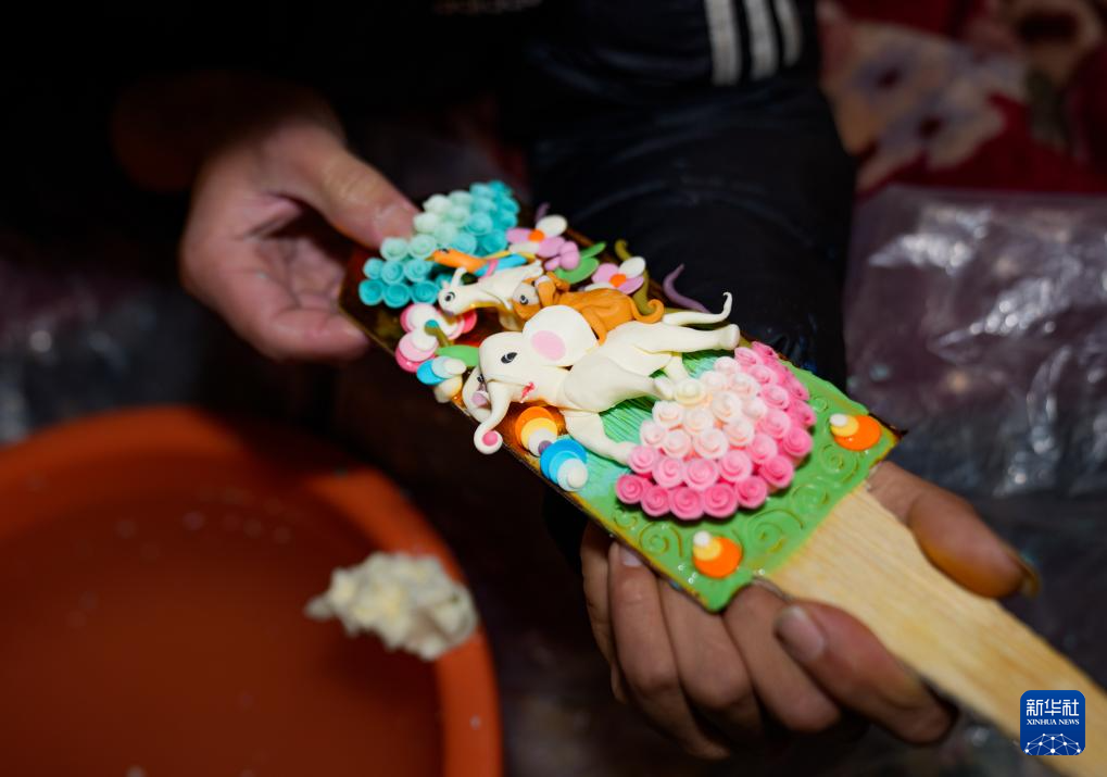 2月12日,在拉薩市林廓東路,來自西藏日喀則市仁布縣普松鄉(xiāng)的手工藝人羅布在制作酥油花。新華社記者 丁增尼達(dá) 攝