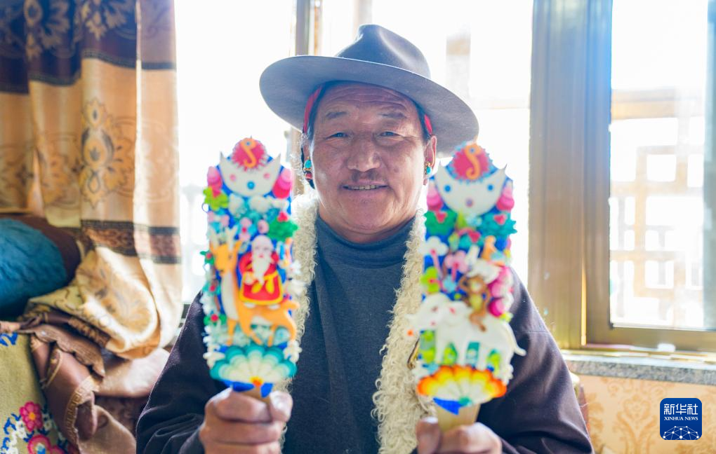 2月12日,在拉薩市林廓東路,來自西藏日喀則市仁布縣普松鄉(xiāng)的手工藝人羅布展示做好的酥油花。新華社記者 丁增尼達(dá) 攝