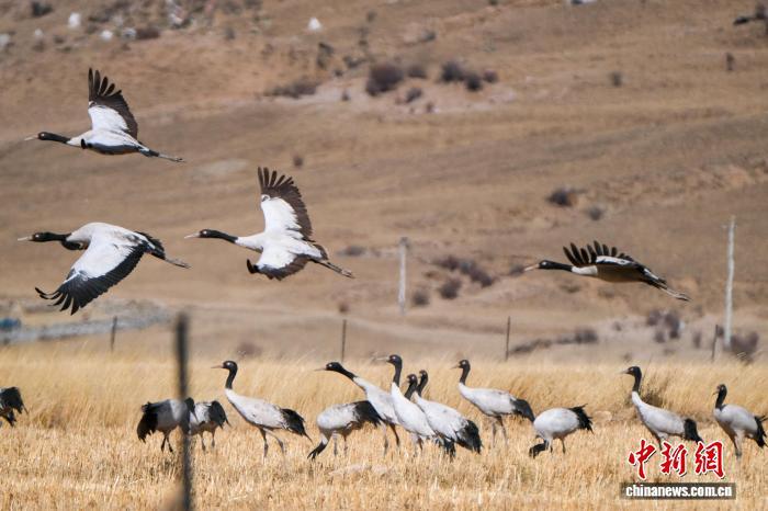黑頸鶴是中國(guó)國(guó)家一級(jí)保護(hù)動(dòng)物,是唯一生活、繁殖在高原的鶴類(lèi),被藏族民眾譽(yù)為“吉祥鳥(niǎo)”。近日,西藏自治區(qū)拉薩市林周縣林業(yè)和草原局介紹,作為黑頸鶴重要的越冬棲息地,今年該縣境內(nèi)黑頸鶴數(shù)量在1800只至2300只之間,其中虎頭山水庫(kù)卡東村一帶占比約一半。中新網(wǎng)記者在周邊看到,不少黑頸鶴在田間覓食,不時(shí)飛翔于高原農(nóng)田、村落上空,舞動(dòng)的鶴影和聲聲鶴鳴為冬春時(shí)節(jié)的高原增添了幾分靈動(dòng)。圖為2月8日,黑頸鶴群在悠閑覓食。江飛波 攝