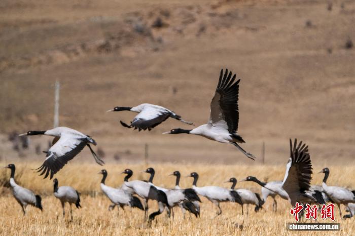 圖為2月8日,黑頸鶴群飛翔于高原。江飛波 攝