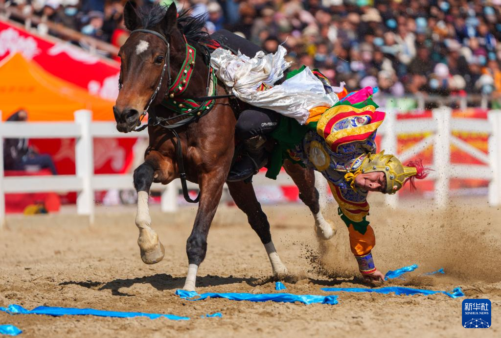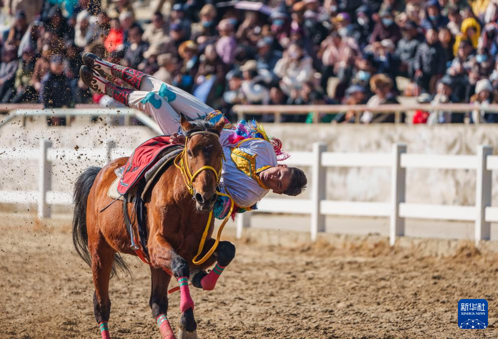 2月20日,馬術隊員在表演馬上拾哈達。新華社記者 丁增尼達 攝