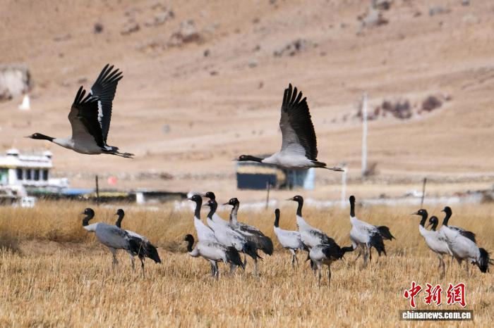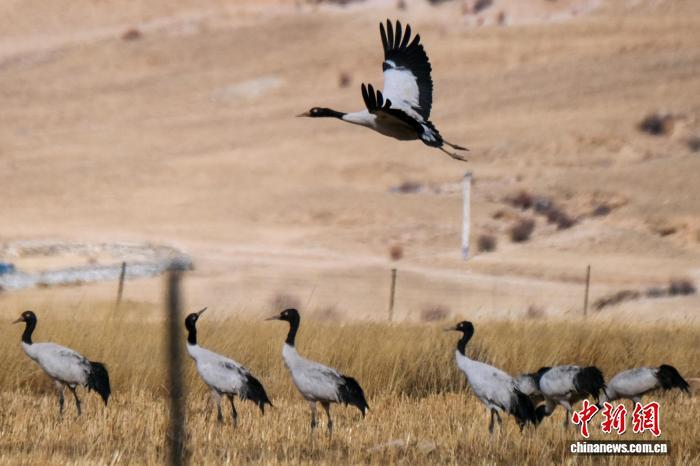 黑頸鶴是中國(guó)國(guó)家一級(jí)保護(hù)動(dòng)物,是唯一生活、繁殖在高原的鶴類(lèi),被藏族民眾譽(yù)為“吉祥鳥(niǎo)”。近日,西藏自治區(qū)拉薩市林周縣林業(yè)和草原局介紹,作為黑頸鶴重要的越冬棲息地,今年該縣境內(nèi)黑頸鶴數(shù)量在1800只至2300只之間,其中虎頭山水庫(kù)卡東村一帶占比約一半。中新網(wǎng)記者在周邊看到,不少黑頸鶴在田間覓食,不時(shí)飛翔于高原農(nóng)田、村落上空,舞動(dòng)的鶴影和聲聲鶴鳴為冬春時(shí)節(jié)的高原增添了幾分靈動(dòng)。