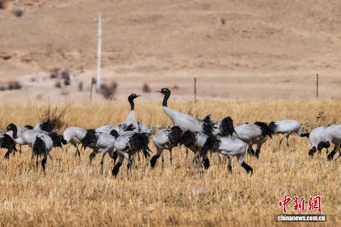 圖為2月8日,一大群黑頸鶴在高原悠閑覓食。江飛波 攝