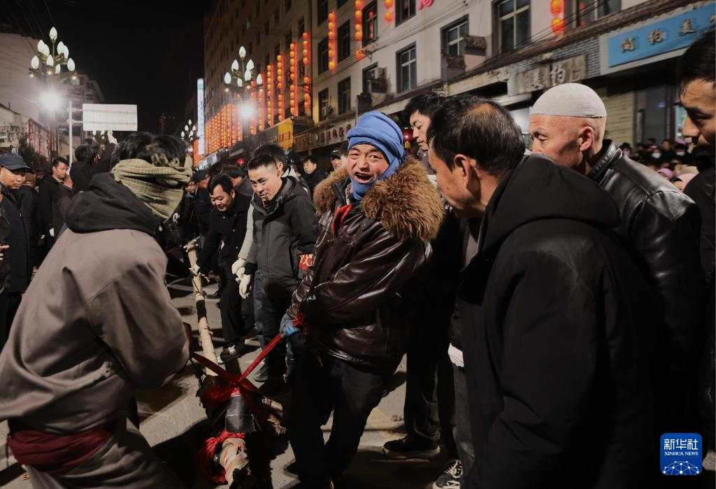 3月3日,在臨潭縣城關(guān)鎮(zhèn)西大街,當(dāng)?shù)厝罕妳⒓印叭f人扯繩”民俗活動(dòng)。新華社記者 張?!z