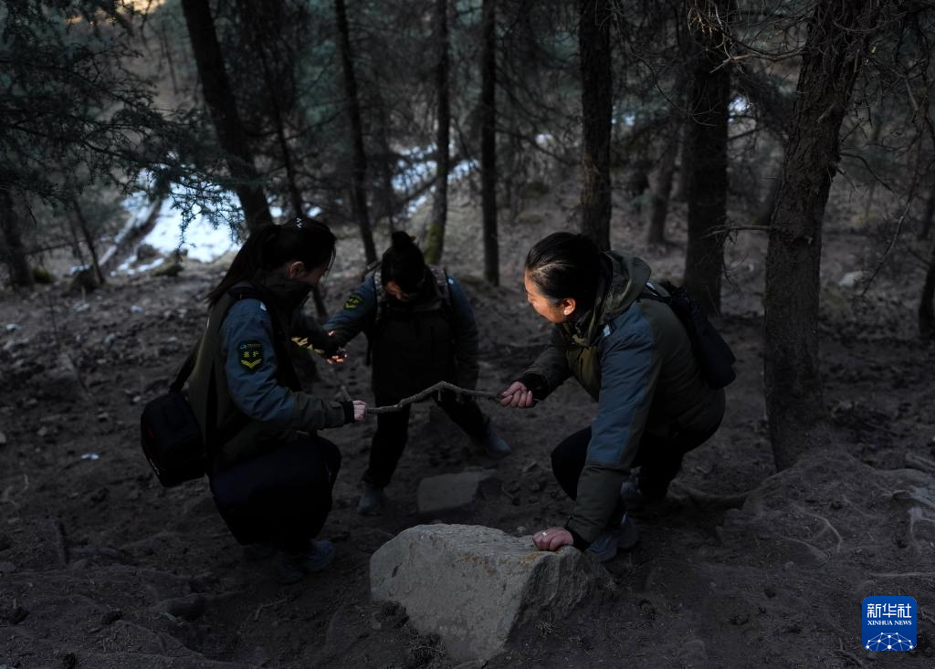 3月6日,祁連山國家公園(候選區(qū))青海片區(qū)青陽溝管護站女子管護員在下山途中相互攙扶。新華社記者 張龍 攝