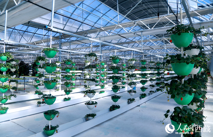 墨竹工卡縣現(xiàn)代農業(yè)示范園內,采用立體懸掛方式種植的草莓。人民網(wǎng)記者 吳雨仁攝