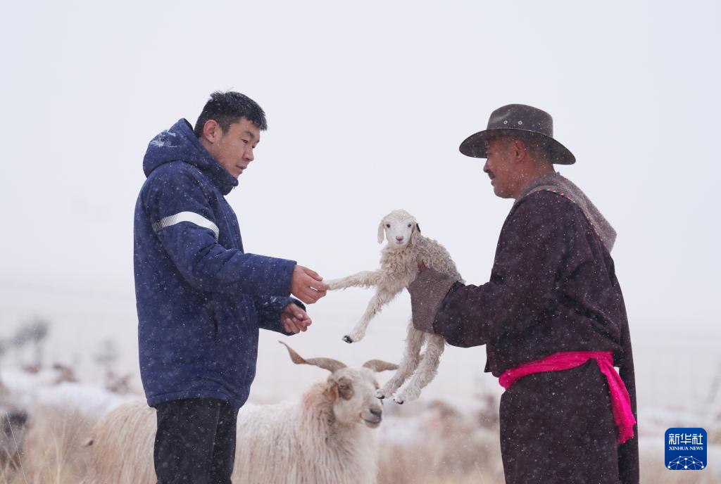 3月8日,在青海省海北藏族自治州祁連縣阿柔鄉(xiāng)草大板村,阿柔鄉(xiāng)畜牧獸醫(yī)站工作人員布銀達拉(左)在查看東寶家轉(zhuǎn)場來的羊羔。新華社記者 張龍 攝