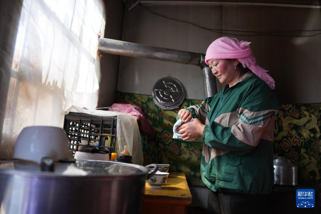 3月7日,在甘肅省張掖市甘州區(qū)堿灘鎮(zhèn)二壩村的借牧點,東寶的兒媳拉中在臨時居住的簡易板房內(nèi)做家務(wù)。新華社記者 張龍 攝