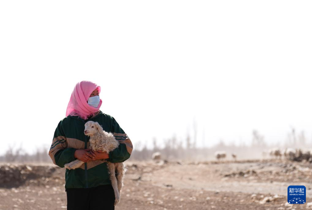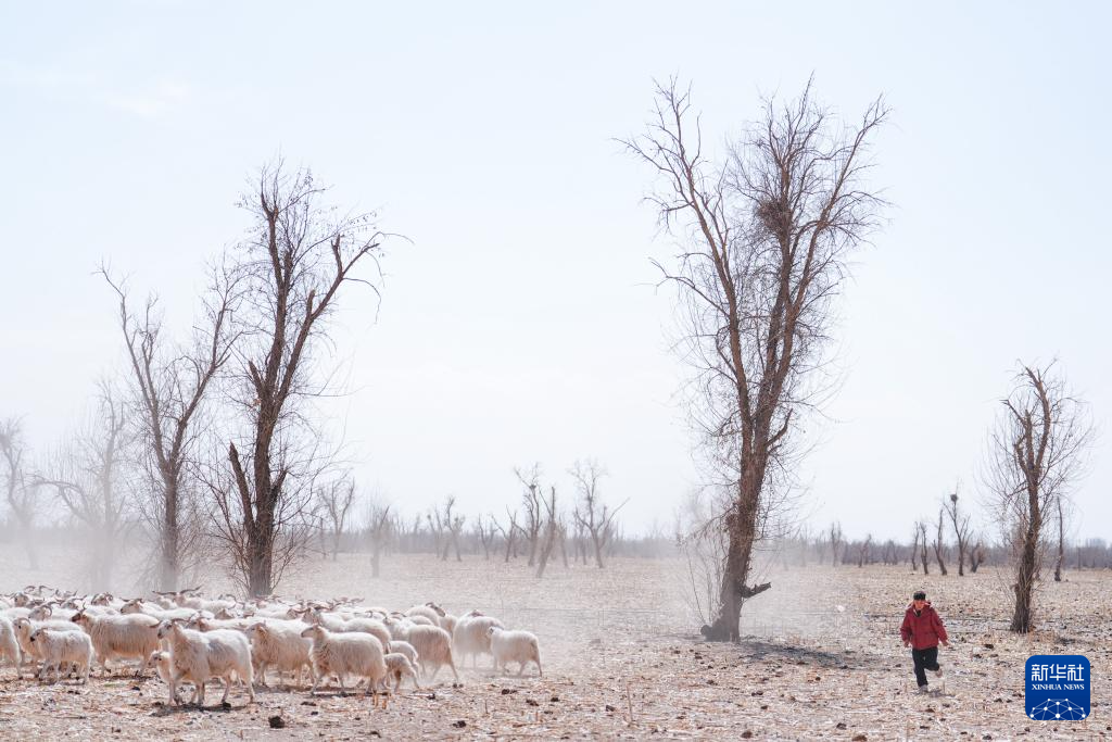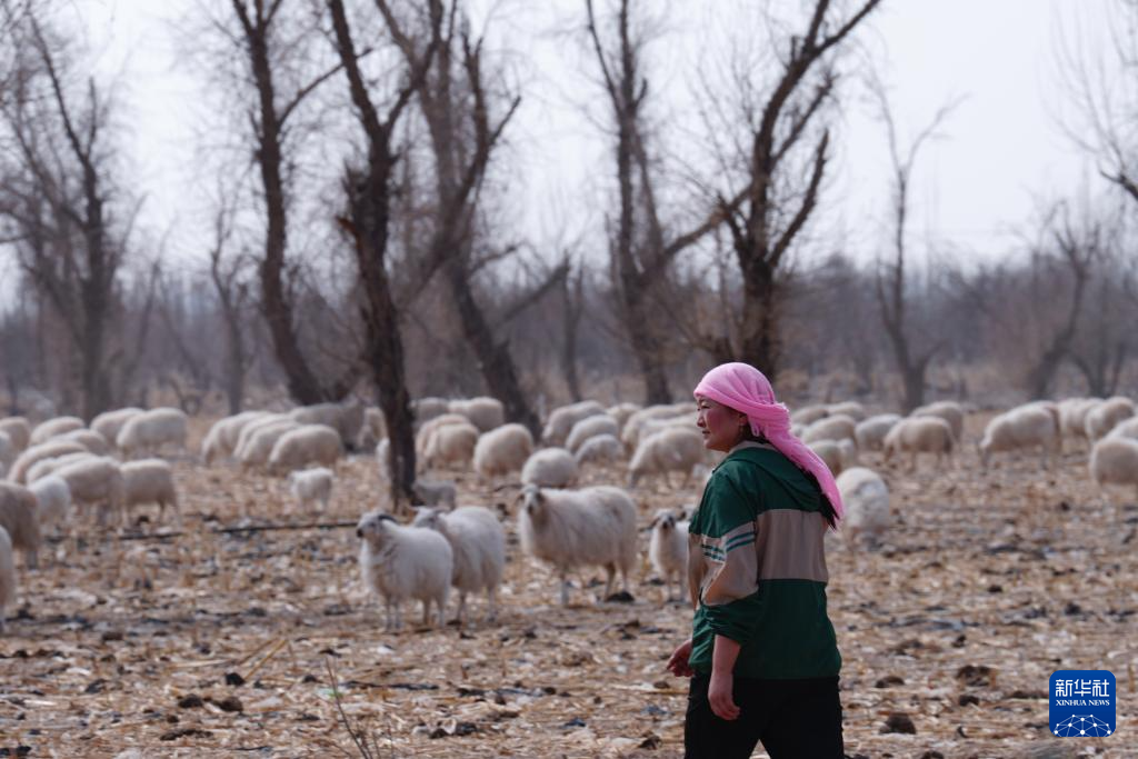 3月7日,在甘肅省張掖市甘州區(qū)堿灘鎮(zhèn)二壩村的借牧點,東寶的兒媳拉中在放牧。新華社記者 張龍 攝