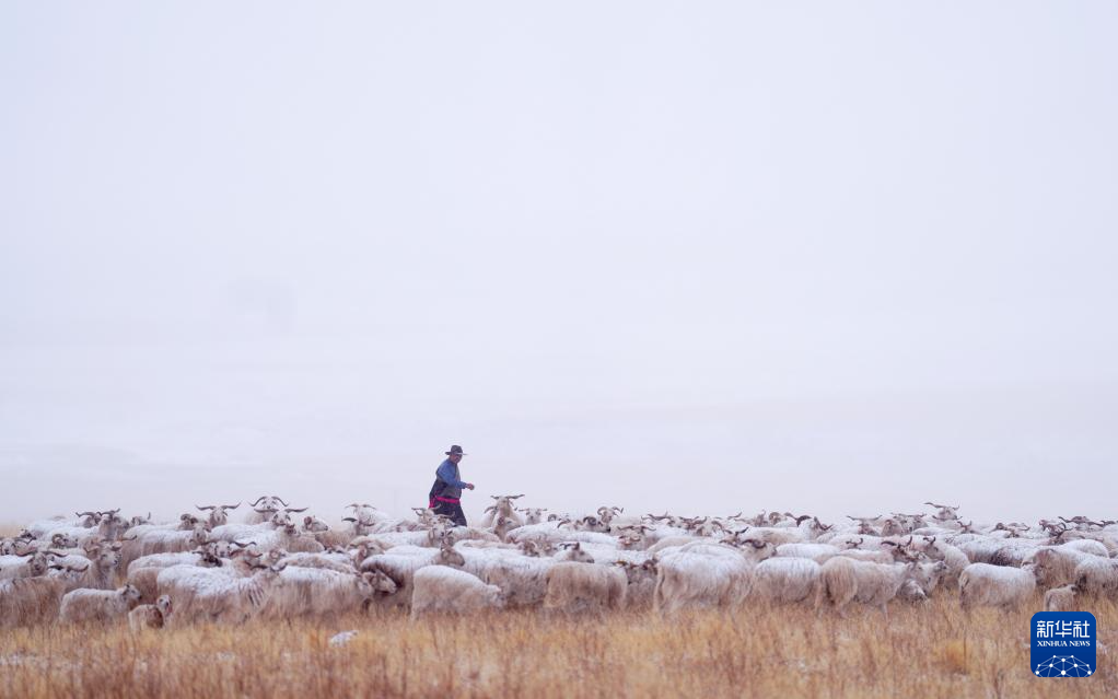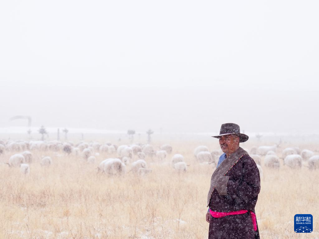 羊群乘車從河西走廊駛來略顯萎靡,但經(jīng)過近半年休整的祁連山草原牧草長勢良好,新生的羊羔放歸草原時活力滿滿,春雪中,牧民東寶充滿了希望。