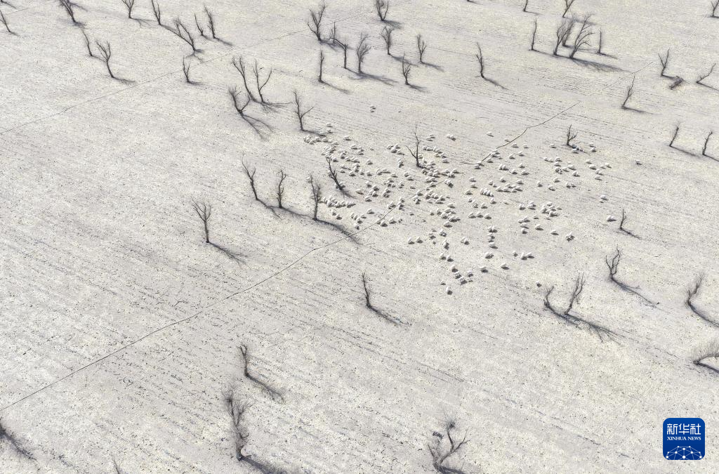 3月7日,在甘肅省張掖市甘州區(qū)堿灘鎮(zhèn)二壩村的借牧點,羊群在玉米秸稈地中覓食(無人機照片)。新華社記者 張龍 攝