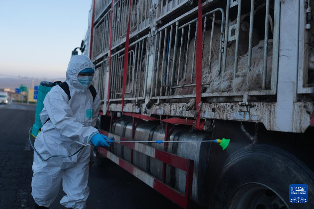 3月7日,在青海省峨堡公路動物衛(wèi)生監(jiān)督檢查站,工作人員在對轉(zhuǎn)運車輛進行消毒。新華社記者 張龍 攝