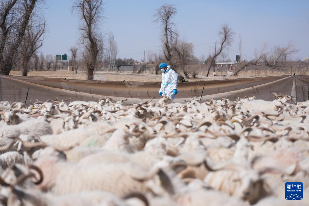 3月7日,在甘肅省張掖市甘州區(qū)堿灘鎮(zhèn)二壩村的借牧點,祁連縣農(nóng)牧部門專業(yè)技術(shù)人員對返場裝車前的羊群進行健康檢查。新華社記者 張龍 攝