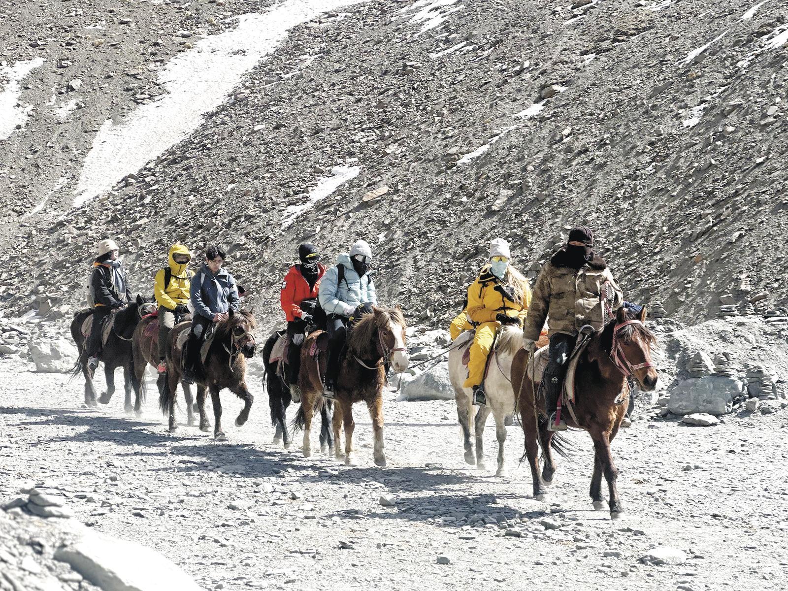行進(jìn)途中,向?qū)冀K走在馬隊(duì)最前方,手中牽引著頭馬,不時(shí)回頭掃視隊(duì)伍。為了讓馬群在崎嶇的山路上保持整齊隊(duì)形、避免擁擠,每次登山前,工作人員都會(huì)細(xì)心地將后一匹馬的韁繩,牢牢系在前一匹馬的尾鞍上。韁繩相連、步調(diào)一致,馬蹄踏過碎石路,穩(wěn)穩(wěn)載著游客向雪峰深處前行。