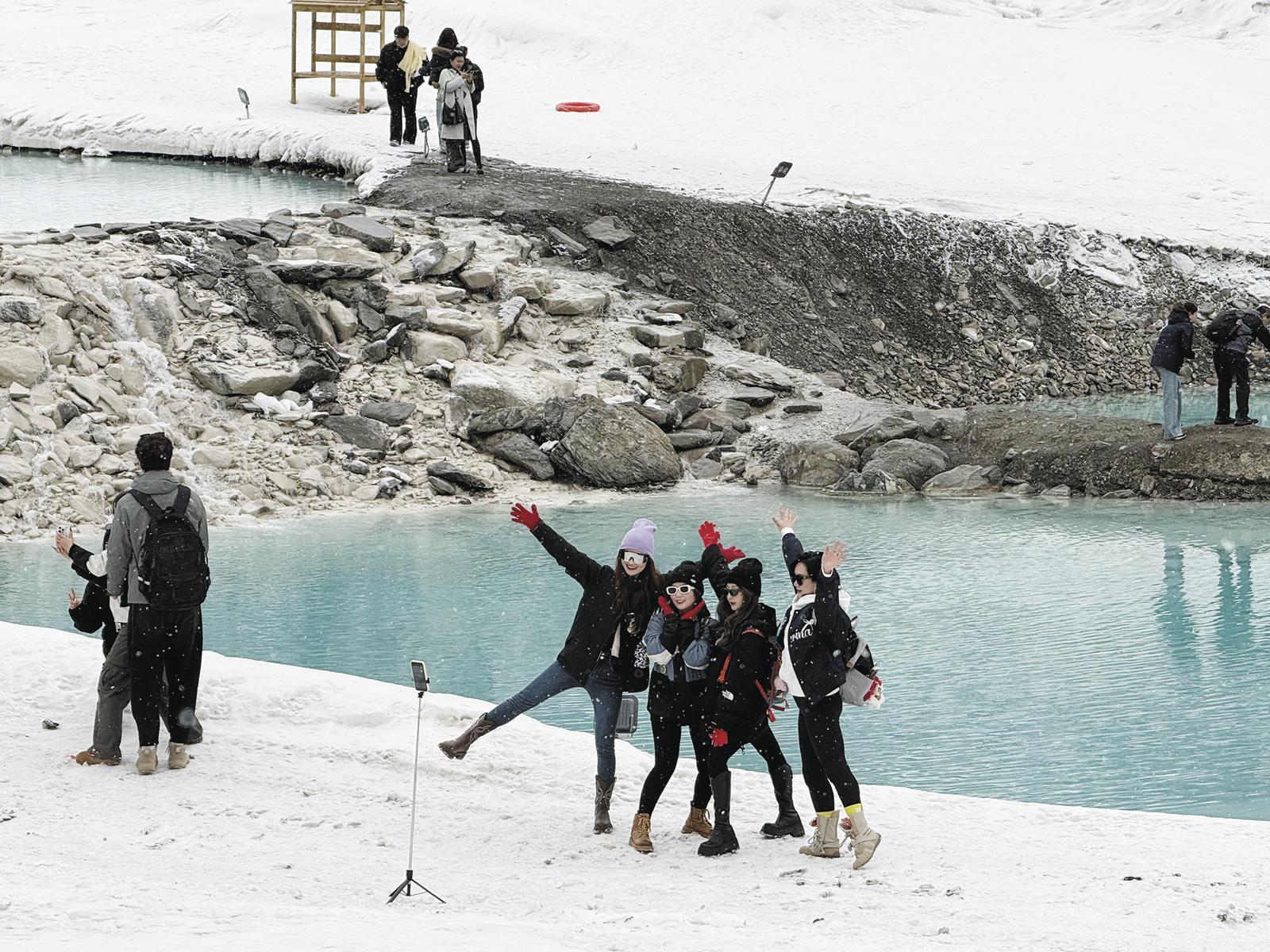 “頭往上抬,仰望天空……”連心湖畔,游客相互指導(dǎo)拍照姿勢,將身后的皚皚雪峰與澄澈湖水一同框進(jìn)鏡頭,定格這份高原獨(dú)有的詩意美好?!敖K于圓夢!第一次在小紅書刷到崗什卡雪峰就被深深吸引,今天特意從蘭州趕來,成功打卡人生第一座雪峰!”游客郭嘉話音剛落,身旁的朋友彭千文接著說:“與其他同類型景區(qū)相比,我覺得崗什卡雪峰更加原生態(tài),剛下擺渡車,我們就被湛藍(lán)的湖水吸引了,景色美得讓人挪不開眼!”
