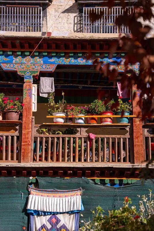 西藏的冬天漫長,寒風(fēng)凜冽,小窗能牢牢鎖住屋內(nèi)的熱氣,讓溫暖留得更久,窗沿兩側(cè)的黑色裝飾,也不只是好看,更能在日照時(shí)吸收熱量,悄悄為房屋添暖,是老輩人藏在細(xì)節(jié)里的保溫巧思。如今日子好了,氣候也有了些許變化,大窗、落地窗漸漸走進(jìn)藏式民居,陽光肆意灑進(jìn)屋里,是生活溫柔的模樣。而那些高一點(diǎn)的建筑,比如拉薩的古建大院,都有著下寬上窄的收分墻,當(dāng)?shù)厝私兴靶眽Α?,底層厚重的石墻扎在土里,上層漸漸輕薄,看似簡單的設(shè)計(jì),藏著滿滿的實(shí)用考量。