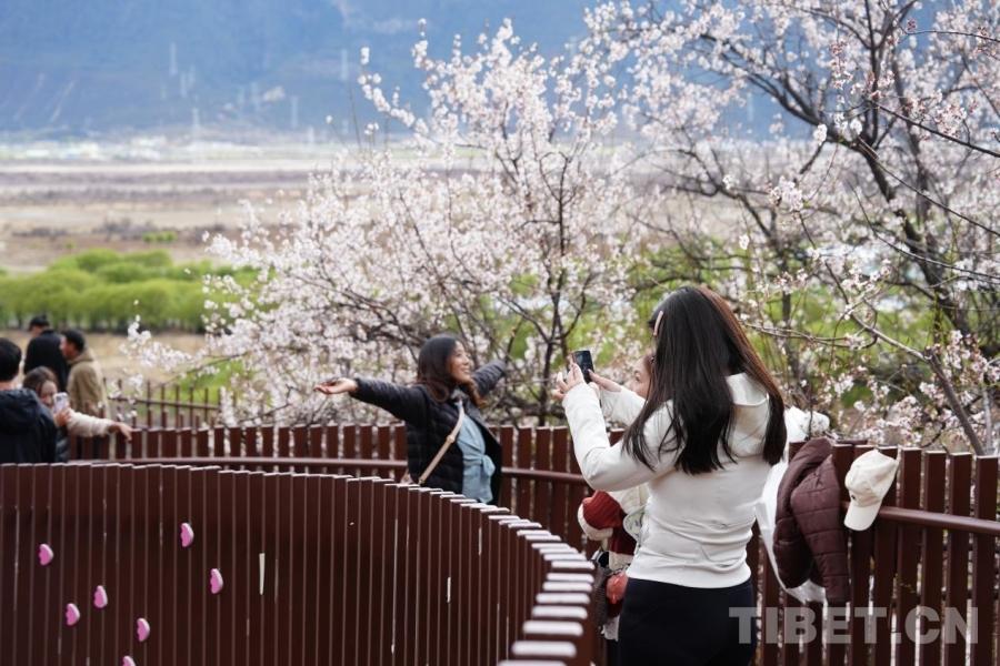 4月4日,游客在西藏林芝市“嘎拉桃花源”景區(qū)里賞花游玩。
