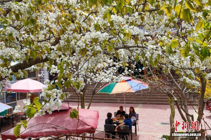 圖為游客正在梨花盛開的農(nóng)家樂中用餐。馬銘言 攝