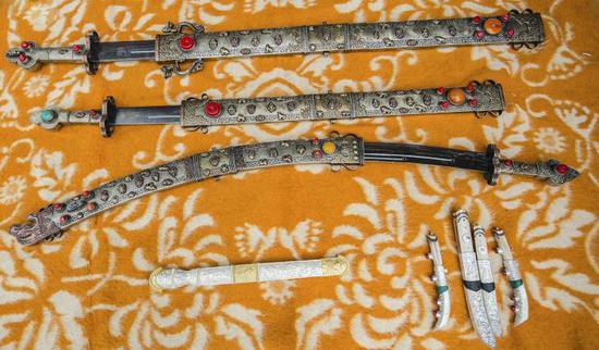 白玉藏刀有重達(dá)十多斤的寶劍、彎刀、也有輕巧的匕首。