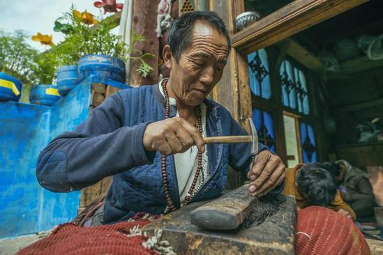 家族式的藏刀制作作坊,由上了年紀(jì)的老人帶領(lǐng)并傳授技藝。