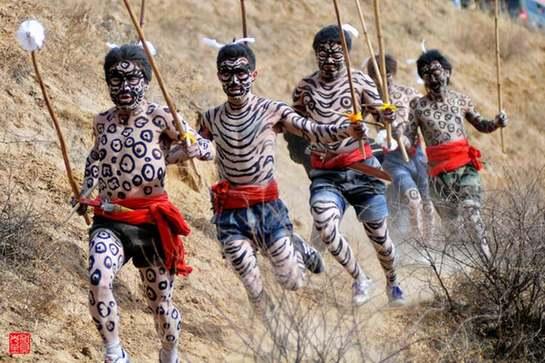 ????祈禱完畢,“白虎”默默點(diǎn)頭應(yīng)允,邊模仿虎習(xí)性跳舞,邊在家里的角角落落驅(qū)邪,而后奔出家門,經(jīng)過村中主要巷道,鄉(xiāng)親們跟隨其后發(fā)聲驅(qū)趕,來到十字路口,“白虎”大吼三聲。然后扮虎者將胡麻草扎的“白虎皮”拋向已準(zhǔn)備好的火堆,火旺邪去,鄉(xiāng)親們興高采烈地跳火禳災(zāi),祈求安康。