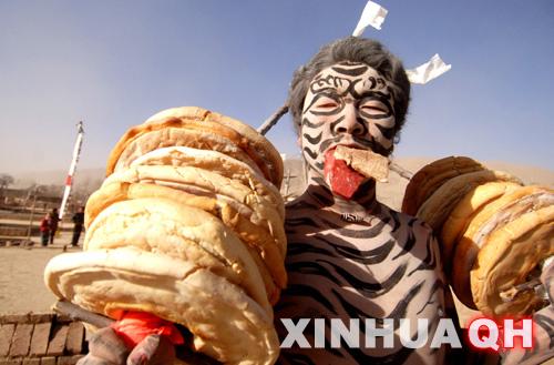 ????每年正月期間,互助土族自治縣五十鎮(zhèn)樺林村舉行的“孛爾斯納頓”上,表演獵人迎娶土族新娘的婚禮習(xí)俗后,即送“白虎”。“白虎”的扮演者由村子里運(yùn)氣順、家境好的年輕人自薦或是由長(zhǎng)輩指定。扮虎者彎著腰,人們用胡麻草在扮演者身上纏出老虎的耳朵、四肢和尾巴等造型,看起來真的像老虎,然后全身插滿點(diǎn)著的香頭。