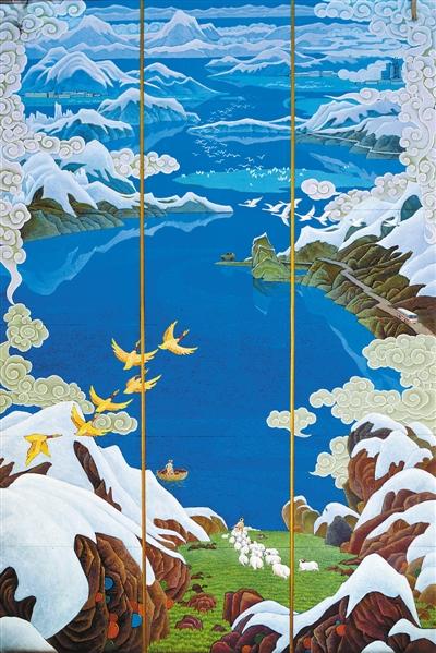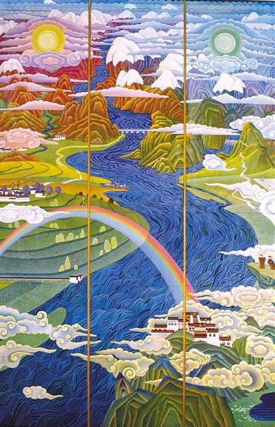 五年磨一劍。這幅歷時(shí)5年、設(shè)計(jì)創(chuàng)作了19稿的作品,對(duì)于葉星生來(lái)說(shuō)不僅是一個(gè)艱辛的磨練,也是對(duì)他繪畫藝術(shù)的一次鍛造和淬煉。它作為一個(gè)時(shí)期的杰作,經(jīng)受住了時(shí)間的檢驗(yàn),懸掛至今,長(zhǎng)達(dá)38年,得到黨和國(guó)家領(lǐng)導(dǎo)人及社會(huì)各界的高度評(píng)價(jià),被《人民日?qǐng)?bào)》《中國(guó)日?qǐng)?bào)》《西藏日?qǐng)?bào)》、中央廣播電視臺(tái)等多家媒體以藏、漢、英、日等多種文字和語(yǔ)言進(jìn)行宣傳報(bào)道,被譽(yù)為“一簇絢麗的民族藝術(shù)之花”“西藏壁畫藝術(shù)新的里程碑”“西藏人民的驕傲”等。在剛剛閉幕的十三屆全國(guó)人大二次會(huì)議上,西藏廳再次成為西藏自治區(qū)人大代表參政議政的重要場(chǎng)所,會(huì)議背景壁畫《扎西德勒?qǐng)D——?dú)g樂(lè)藏歷年》同時(shí)被各媒體頻頻曝光,恭賀扎西德勒、西藏吉祥。