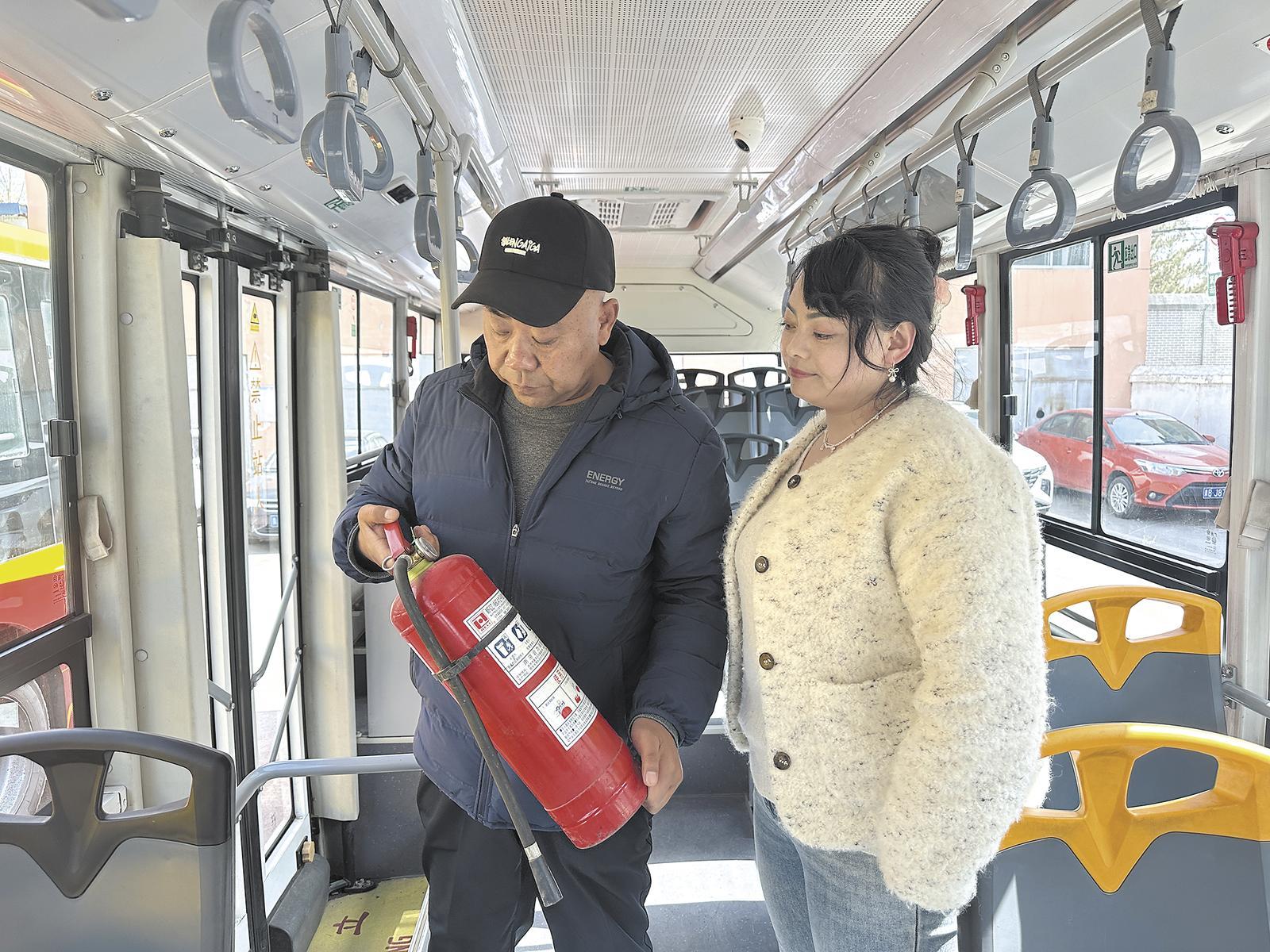 魯沙爾車隊(duì)隊(duì)長(左)檢查915路索爾加公交車消防器材。記者 劉祎 攝
