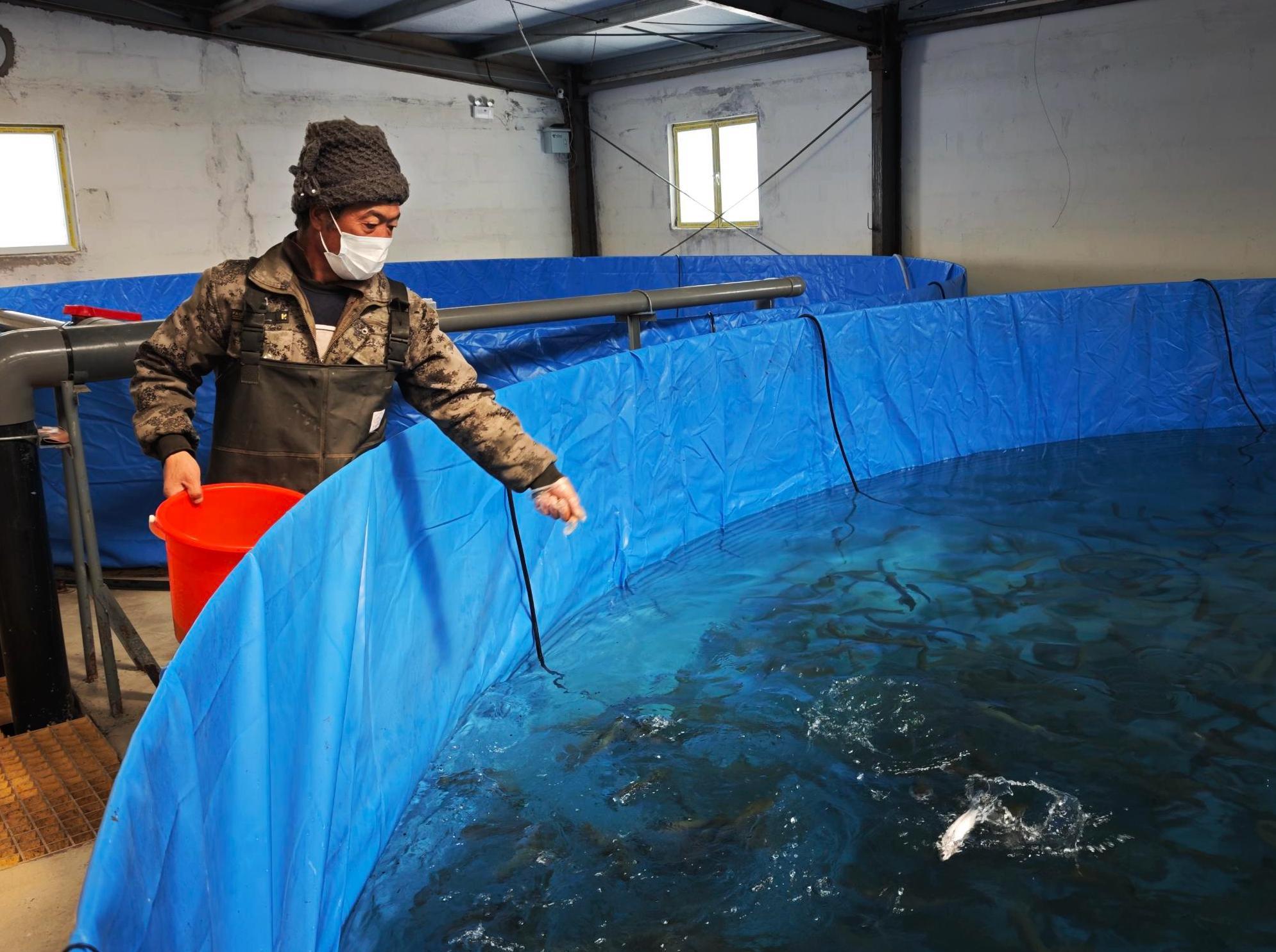 基地負(fù)責(zé)人楊光介紹,目前池子里正茁壯成長著約2萬尾虹鱒魚,經(jīng)過近10個月的精心喂養(yǎng),目前每條重量達(dá)到一斤左右?!邦A(yù)計在今年年底,這些魚將被出售,按照當(dāng)前的市場價格估算,銷售額達(dá)到300多萬元。此外,基地還有5萬尾鱸魚,也將在今年6月出售?!?/p>