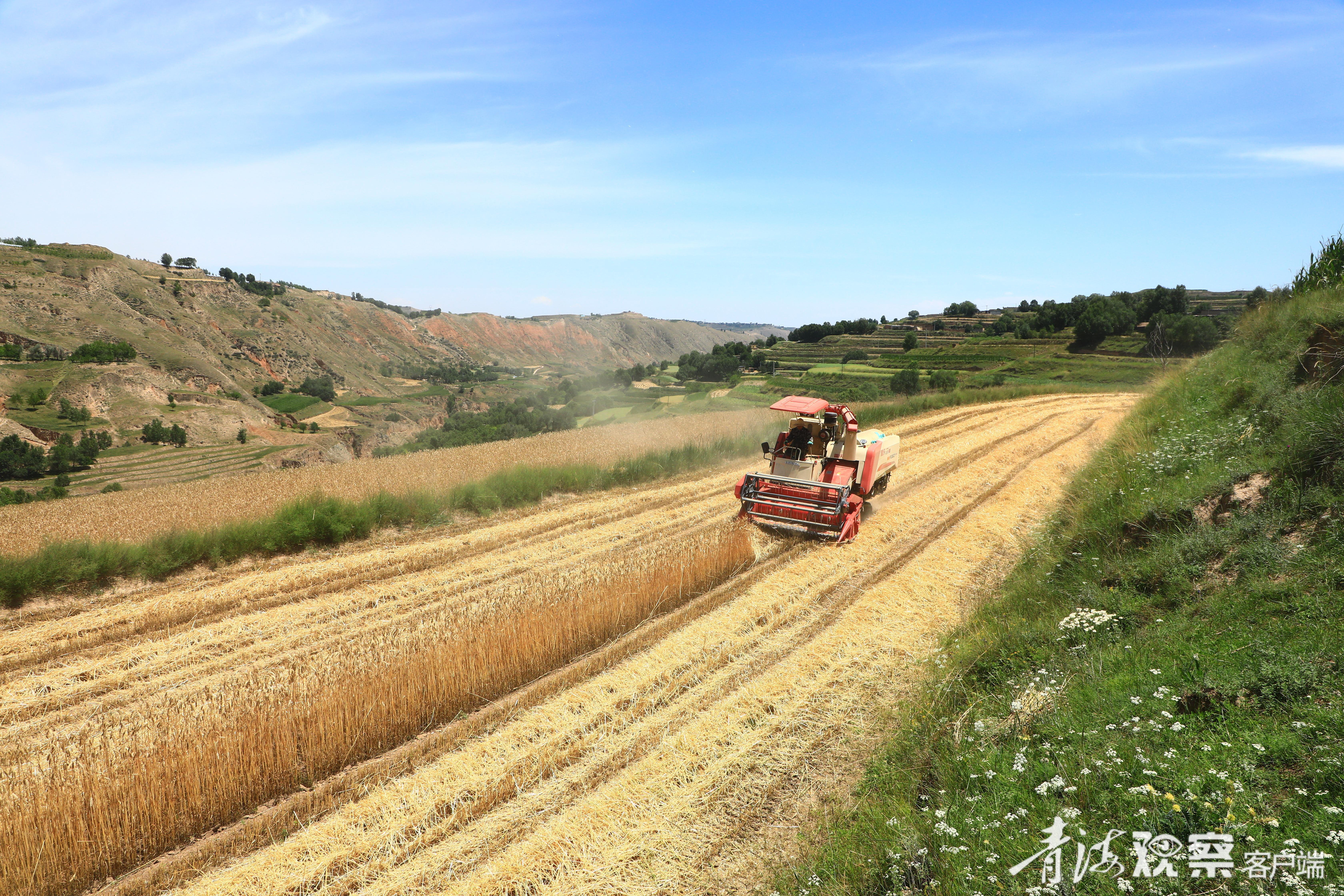 時(shí)下正值夏收季節(jié),站在海東市民和回族土族自治縣北山鄉(xiāng)先鋒村的山梁上放眼望去,麥浪翻滾,收割機(jī)往返穿梭,滿眼夏收好“豐”景。