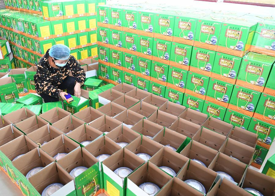 芥菜加工企業(yè)工作人員將芥菜進(jìn)行打包。新華網(wǎng)發(fā)(韓靜 攝)